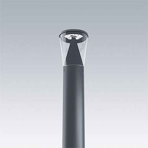 Nenápadné svítidlo instalované na vrch sloupu s 18 LED ovládanými při 1050mA s Radiální symetrická, komfortní vyzařovací charakteristikou. Pevný výstup LED předřadník. Elektrická Třída ochrany II, IP66, IK10. Základna: Litý pod tlakem hliník (EN AC-44300). Povrchová úprava: práškově nanášený hliník, s texturou antracit (odstín blížící se RAL7043). Difuzor: stabilizovaný vůči UV záření čirý polykarbonát. Zapojení předem pomocí kabelu o délce 3m.. Sloupek je třeba objednat zvlášť. Dodáváno s LED zdroji v barvě 3000K.