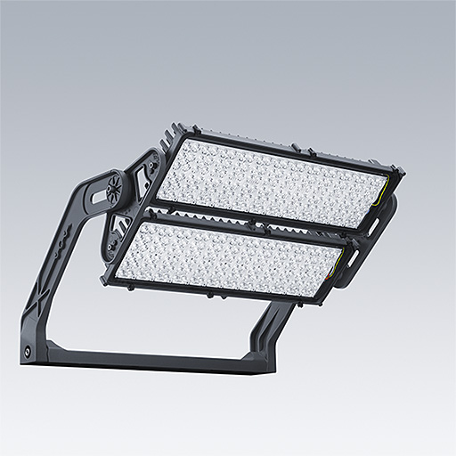 Projecteur LED haute puissance avec distribution lumineuse Optique 1 : faisceau étroit; Optique 2 : faisceau étroit; de 336 LED. Appareillage externe, Fourni uniquement par Thorn Lighting, à commander séparément (courant de transmission maximum 1050 mA) et câblage via câble de type H07 RN-F et mini-diamètre de 13 mm. Classe électrique I, IP66, IK08. Dissipateur thermique : Moulage sous pression aluminium thermopoudré gris foncé (similaire à RAL 7043). Support de fixation et cadre : gris foncé (similaire à RAL 7043). Fermeture : 4 mm transparent verre. Fourche montée à l’aide des points de fixation disponibles (une vis M20 et deux vis M14). Fonctionnement à faibles papillotements (< 1 %) adapté à une diffusion TV haute définition. Livré avec LED 4 000 K