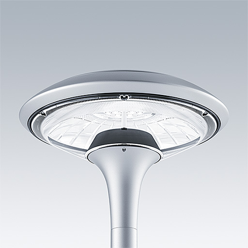 Plurio Direct : Lanterne LED décorative à montage top avec distribution Radialement symétrique. Driver avec 18 LED entraînés à 500mA. Classe électrique II, IP66, IK08. Base : coulé aluminium, thermopoudré gris argent. Chapeau : forme disque, aluminium, texturé gris argent. Diffuseur : anti-UV, transparent Polycarbonate (PC) avec prismes anti-éblouissement. Optique à lentille direct avec réflecteur interne Equipé d'un 50% circuit de réduction de puissance, qui entre en vigueur 3 heures avant et 5 heures après un minuit calculé. Il peut être désactivé à l'installation avec un interrupteur interne facilement accessible. Livré avec LED 4 000 K. Montage top sur mât de Ø 60mm.