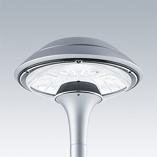Plurio Direct : Lanterne LED décorative à montage top avec distribution Radialement symétrique. Driver avec 18 LED entraînés à 500mA. Classe électrique II, IP66, IK08. Base : coulé aluminium, thermopoudré gris argent. Chapeau : forme plat, aluminium, texturé gris argent. Diffuseur : anti-UV, transparent Polycarbonate (PC) avec prismes anti-éblouissement. Optique à lentille direct avec réflecteur interne Equipé d'un 50% circuit de réduction de puissance, qui entre en vigueur 3 heures avant et 5 heures après un minuit calculé. Il peut être désactivé à l'installation avec un interrupteur interne facilement accessible. Livré avec LED 4 000 K. Montage top sur mât de Ø 60mm.